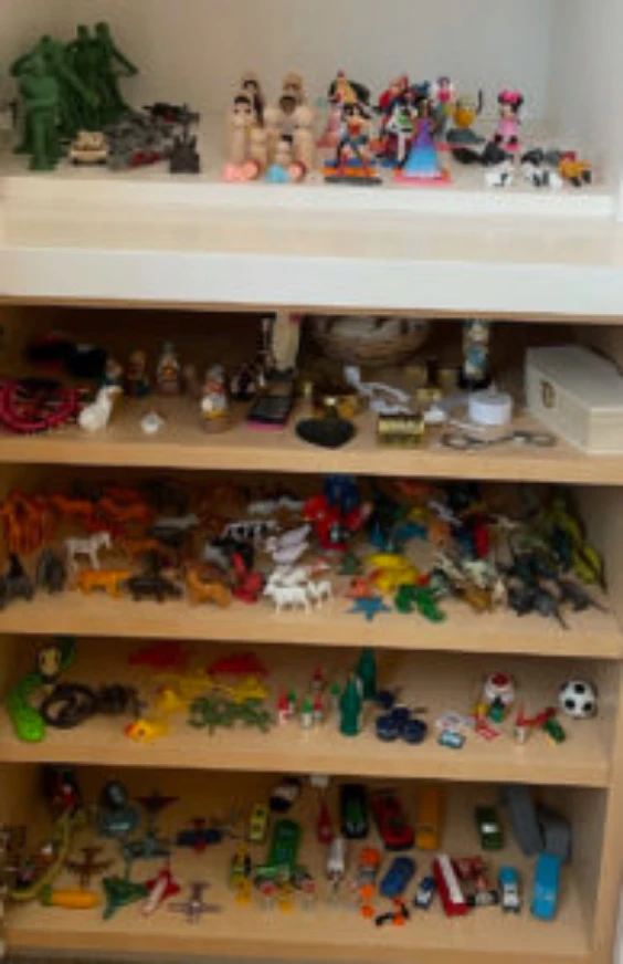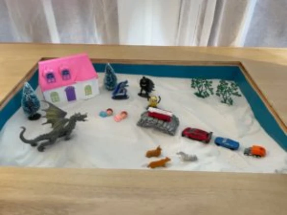 One specialized form of play therapy is called Sandplay therapy. Children can choose either a tray of wet or dry sand as well as a variety of miniature toys to place in the sand. Miniatures may include anything from farm animals and dinosaurs to people, superheroes and vehicles. Trees, fences, household items, and buildings are common as well.